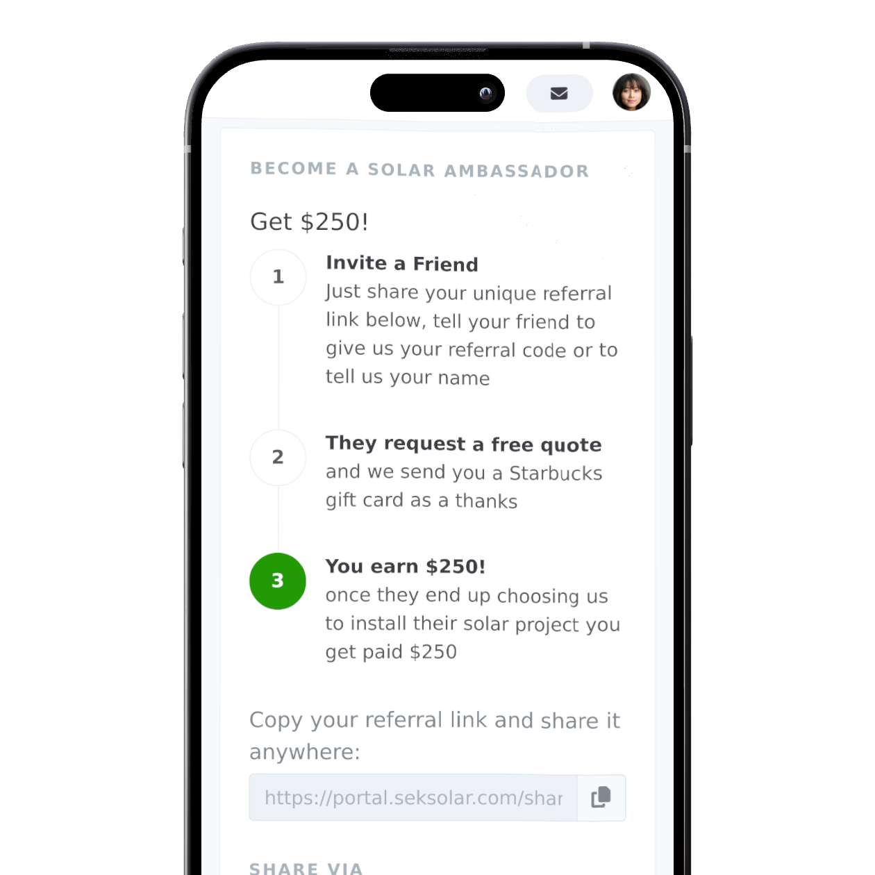 Have you been happy with SEK Solar? Refer a friend or family member conveniently by sending their contact info through the app or sharing your personalised referral page with them and earn money as a thank you.